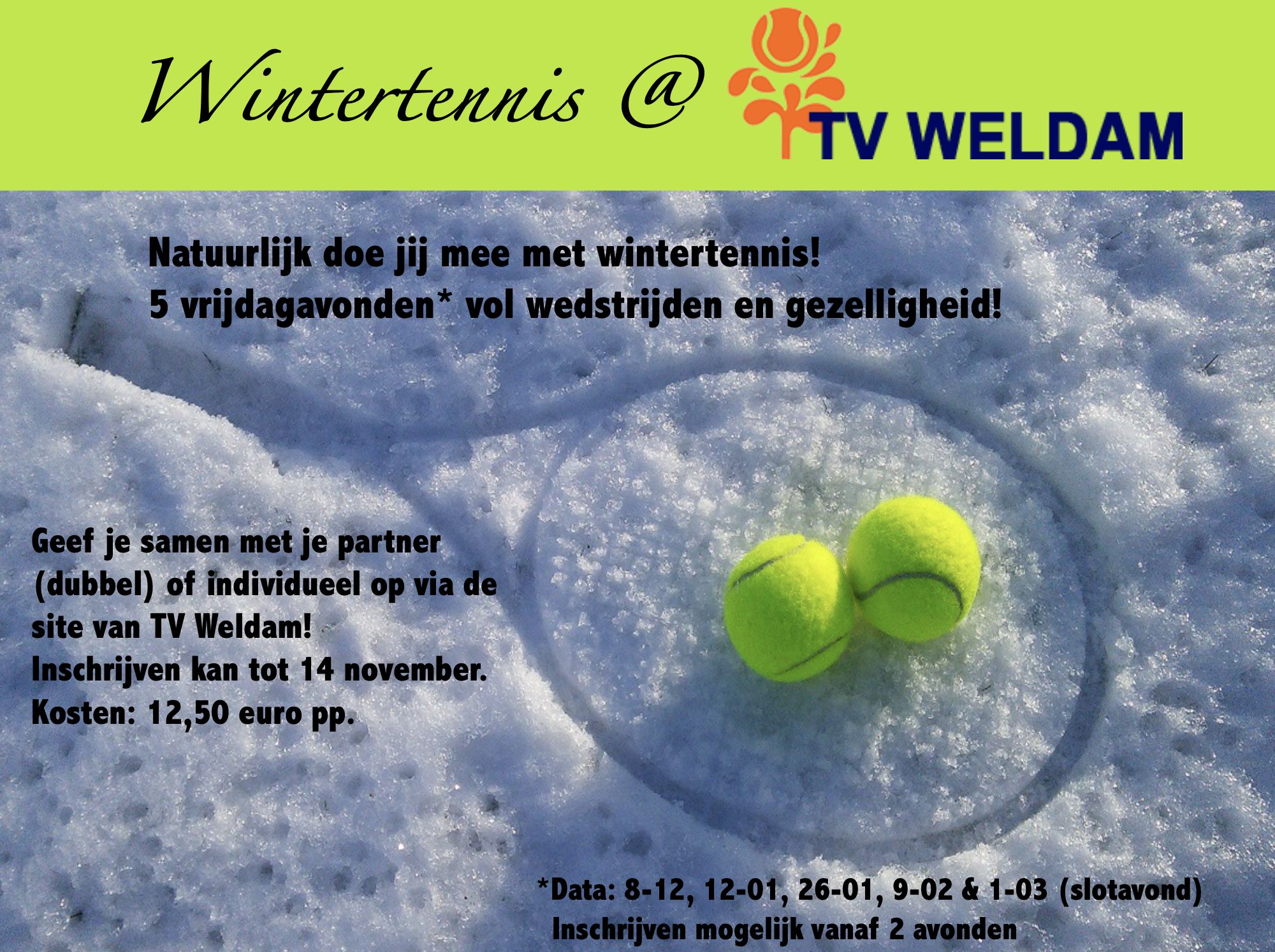 We willen jullie van harte uitnodigen om deel te nemen aan het Wintertennis-toernooi op de vrijdagavond. De opzet van voorgaande jaren zal worden herhaald. Er zijn vier (thema) speelavonden en een gezamenlijke slotavond.