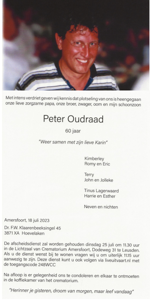 Afgelopen week ontvingen wij de droevige mededeling dat ons lid Peter Oudraad op 60 jarige leeftijd plotseling overleden is. Peter is al heel lang een gewaardeerd lid van onze vereniging. Een graag geziene speler op de toernooien van TV Weldam en zette zich daarnaast in als vrijwilliger voor onze vereniging, onder andere bij de organisatie van de Hoflake Open. Wij wensen de familie heel veel sterkte toe met de verwerking van dit verlies.