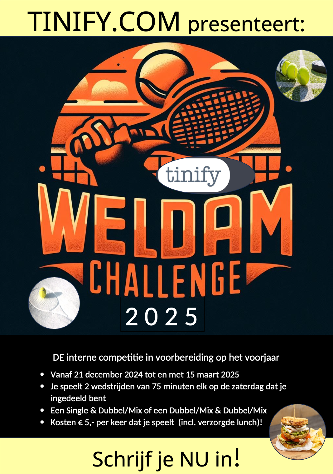 Na het grote succes van vorig jaar staat de Tinify Weldam Challenge ook dit jaar weer op de kalender! Deze interne competitie overbrugt de winterstop tussen de Voor- en Najaarscompetitie en is perfect voor zowel fanatieke spelers als sociale tennissers. Of je nu net begint of een ervaren clubkampioen bent, iedereen maakt kans om de felbegeerde trofee te winnen. Wie mag dit jaar de titel van Erik Bock overnemen?